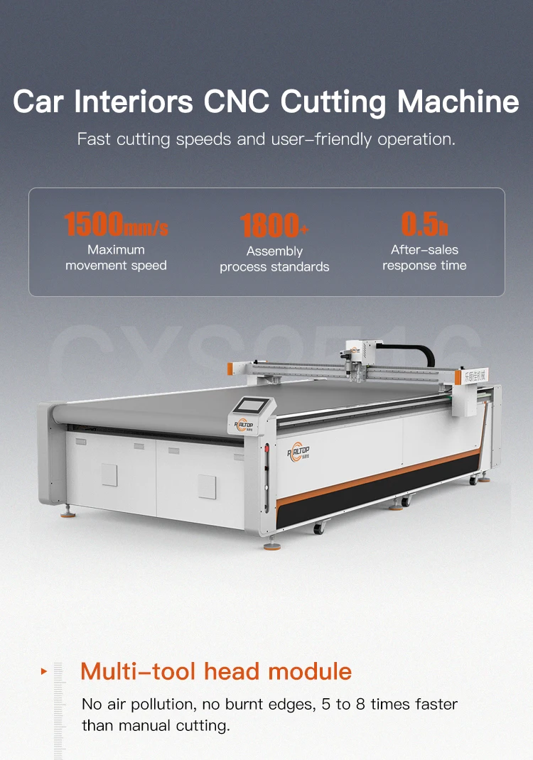 Cold Cutting Technology✳Zero Thermal Damage:Utilizes high-frequency vibrating blades for physical cutting. eliminating laser-induced issues like scorching. discoloration. or odors.Ideal for heat-sensitive materials (TPE. leather. PVC). complying with automotive interior VOC standards.✳Edge Quality:Smooth. burr-free cuts requiring no secondary polishing. ensuring aesthetic and functional integrity for seat covers. floor mats. etc.Ultra-High Precision & Efficiency✳Precision Control:Repeat positioning accuracy ≤0.1mm. enabling precise adaptation to complex 3D contours (e.g.. seat rails. accelerator pedal protrusions).✳High-Speed Production:Cuts a full set of car floor mats in 3-5 minutes.Mold-Free Flexible Production✳Eliminates mold development costs.✳One-click design switching via CAD files (supports DXF/PLT/AI formats). completing model changes in <1 minute.Intelligent Material Management✳Auto-Nesting System:Camera-based defect detection optimizes cutting paths. boosting material utilization by 15%–30%. reducing waste of premium leather/TPE.✳Vacuum Table + Smart Pressing:Ensures zero interlayer misalignment during multi-layer composite cutting (e.g.. leather+EVA. tufted fabric+rubber base). resolving delamination issues.